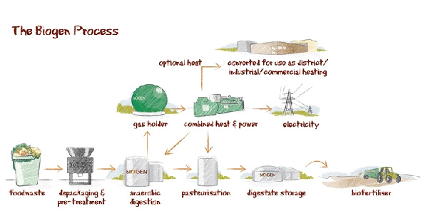 Anaerobic Digestion uses microorganisms to break down food waste, animal manure, slurries and energy crops in the absence of oxygen inside an enclosed system. As it breaks down it gives off methane which is collected and converted into bio-gas and used to generate electricity, heat or transport fuels. It also creates a nutrient-rich digestate that can be used as a fertiliser for agriculture and inland regeneration.